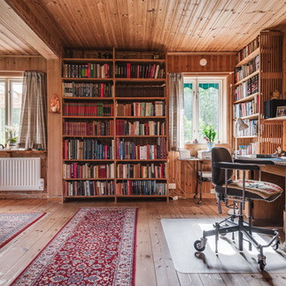 Schöne Holzdielenböden unterstreichen die ursprüngliche schwedische Gemütlichkeit in dem großen Wohnzimmer, das sich zur gut isolierten Veranda erweitert.