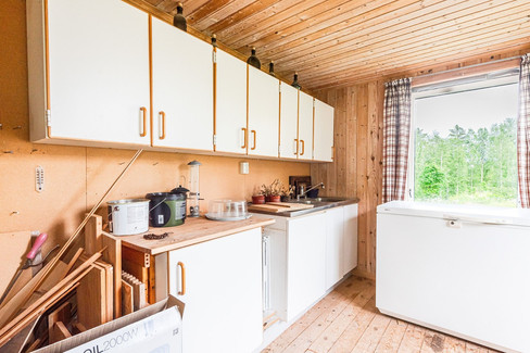 Beachtlich ist das Nebengebäude, das Stromanschluß hat und dank guter Isolierung ganzjährig als Werkstatt und Hobbyraum genutzt werden kann. Auch ein Carport ist hier integriert.