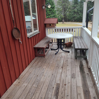 Das Gästehaus, ein knuffiges Blockhaus mit überdachtem Eingang und Terrasse, wurde 2013 renoviert. Es hat Stromanschluß, jedoch keinen Wasseranschluß. Für angenehme Wärme sorgen elektrische Heizelemente und ein offener Kamin sowie ein Holzofen. Brandschutzkontrolle wurde 2025 durchgeführt.