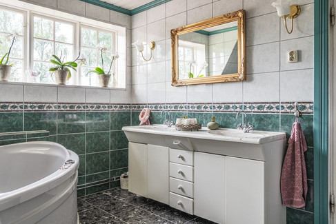 Das Badezimmer im Dachgeschoß ist mit einer Badewanne und einer Dusche ausgestattet. Fliesenboden mit Fußbodenheizung sorgen für Behaglichkeit.