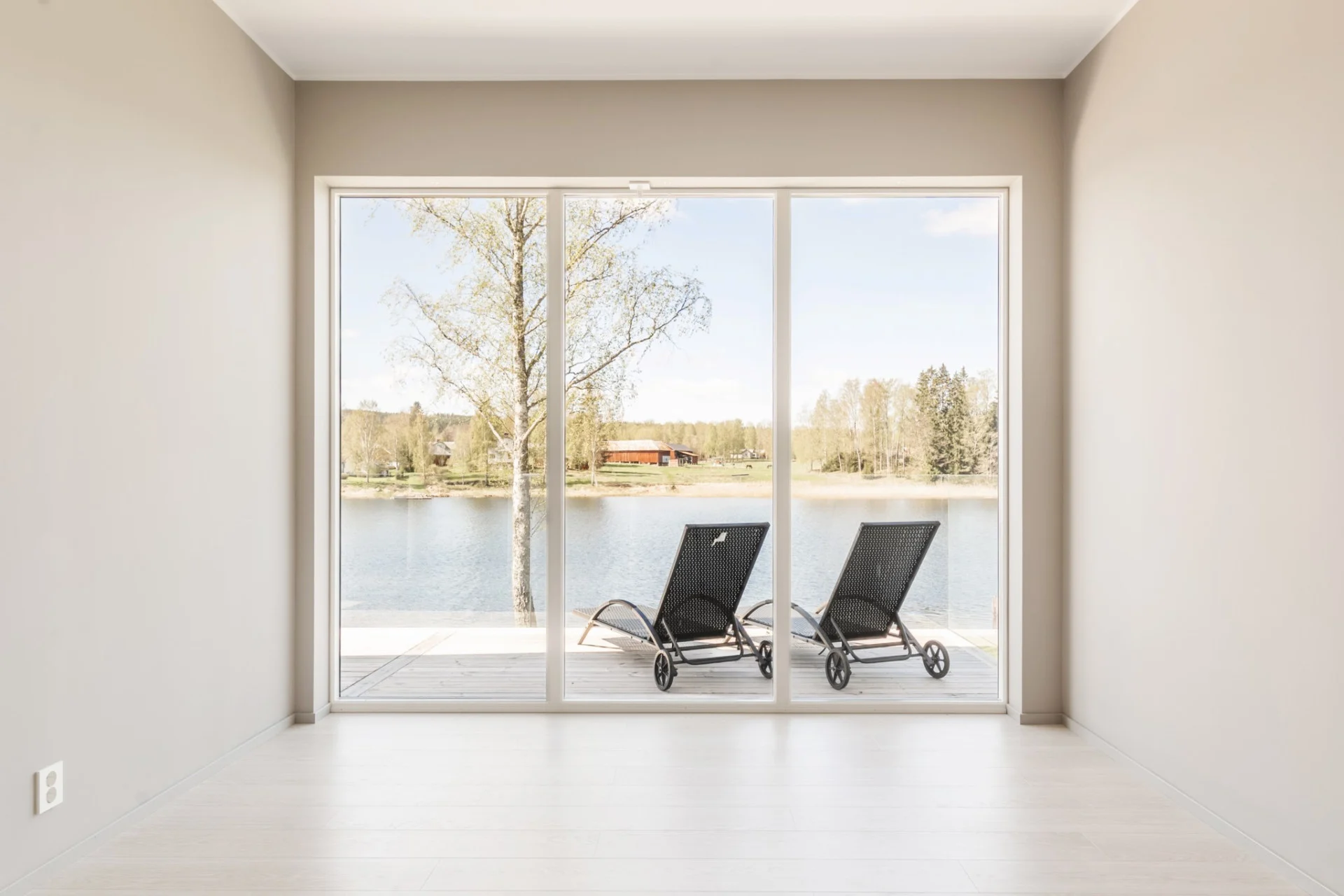 Große bodentiefe Panoramafenster lassen den Übergang von außen und innen verschmelzen - ein herrliches Raumerlebnis mit nahtlosem Übergang zur Natur durch große zu öffnende Flächen und eine Raumhöhe von 270 cm.