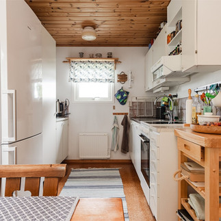 Küche in offener Raumlösung übergehend in Eßbereich und Wohnzimmer