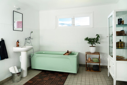 Das Badezimmer mit Dusch-/Badewanne ist gekachelt ebenso wie der Hauswirtschaftsraum, in dem sich die Tiefkühltruhe und die Waschmaschine befinden.