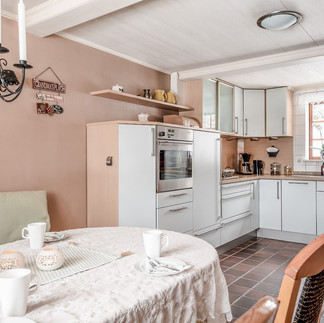 Das Gästehaus wartet mit einem Allraum auf, der Küche und Wohnbereich bietet, außerdem ein Duschbad, zwei Schlafzimmer und einen Hauswirtschaftsraum mit Waschmaschine und Trockner.