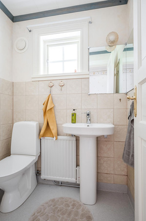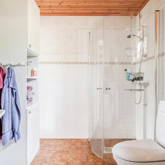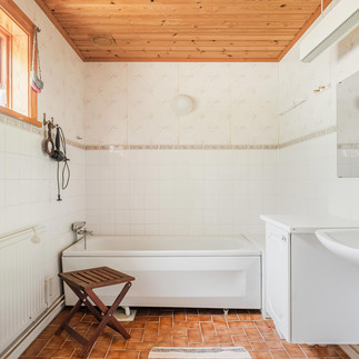 und ein Badezimmer mit Dusche und Wanne sowie ein WC. Ein weiteres Schlafzimmer mit Bad befindet sich im Dachgeschoß, das über eine geschwungene Treppe erreicht wird.