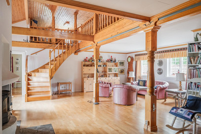 Weitläufige mit Parkett belegte Räumlichkeiten und Zugänge zur Terrasse finden Sie hier: Ein Speisezimmer mit Kachelofen, verbunden mit dem Wohnzimmer durch eine Galerie