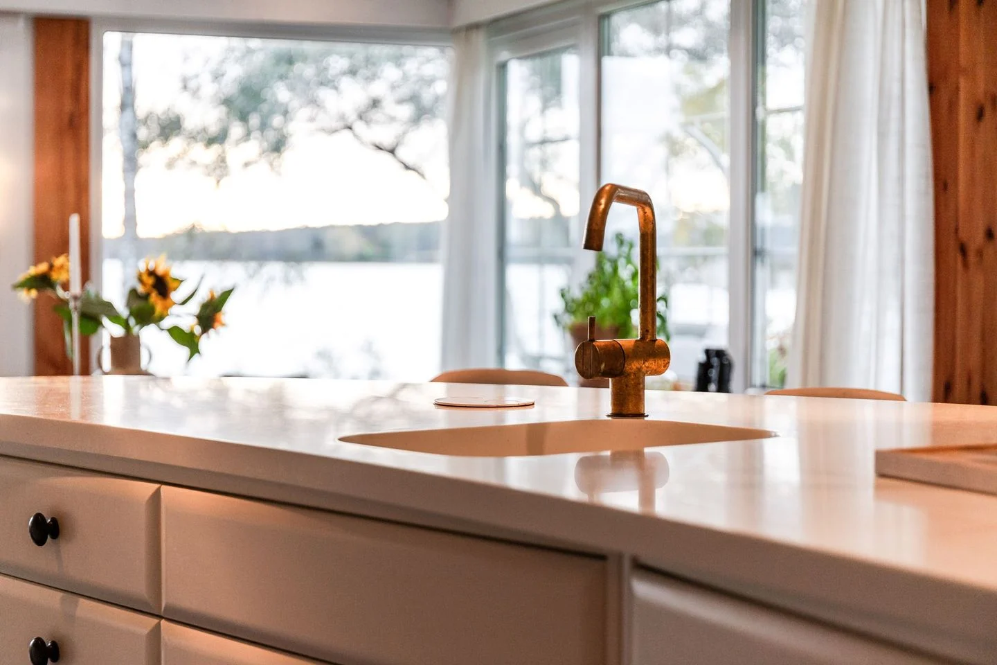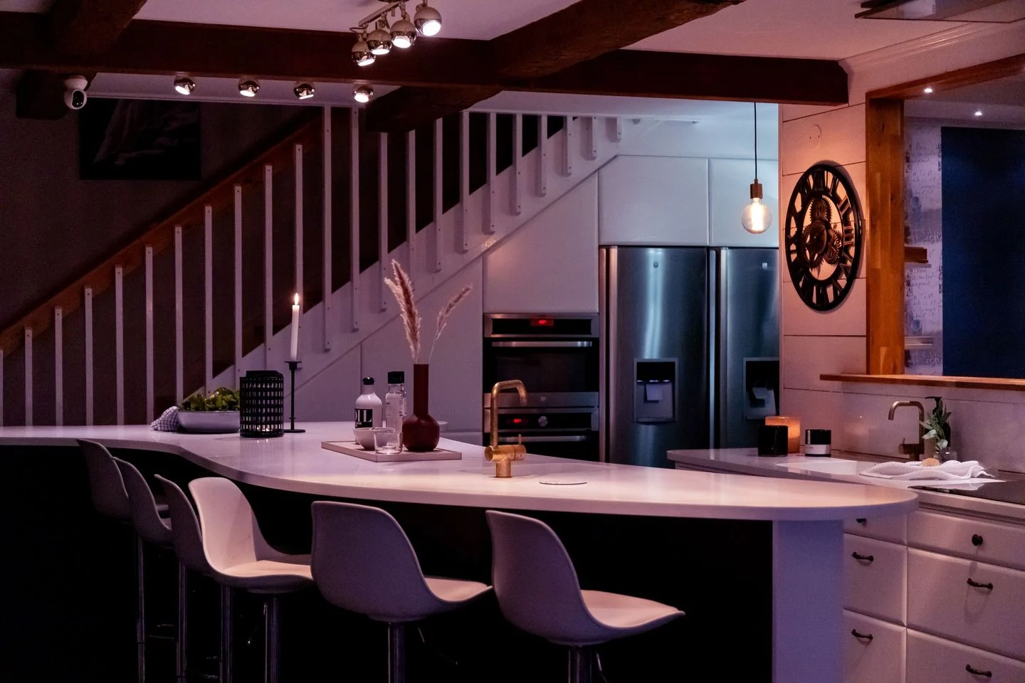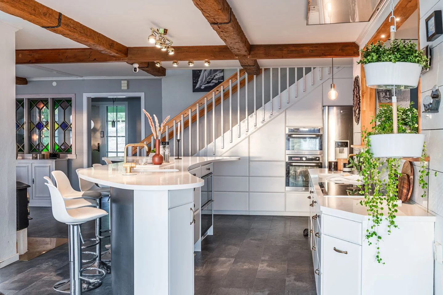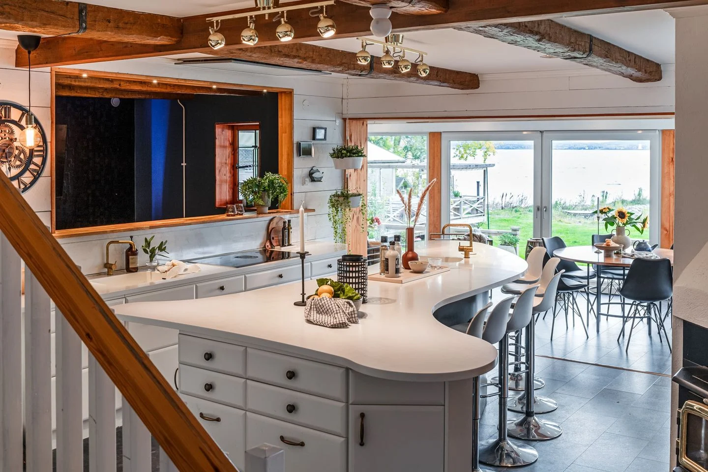 Die hochwertige Küche mit ausgedehnter Kücheninsel und Bar sowie sich anschließendem Eßplatz, übergehend in das Wohnzimmer, bildet das Zentrum des Hauses.